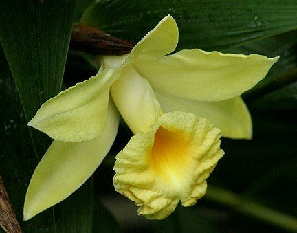 Planta epífita o litófita (sobre rocas) de hasta 180 cm de alto. Tallo fuerte cubierto por vainas que son verde pálido con manchas café-rojizo. Hojas articuladas con las vainas, oblongas-lanceoladas, Flores solitarias, terminales, grandes y muy vistosas, de color amarillo, subsésiles (de peciolo muy corto).