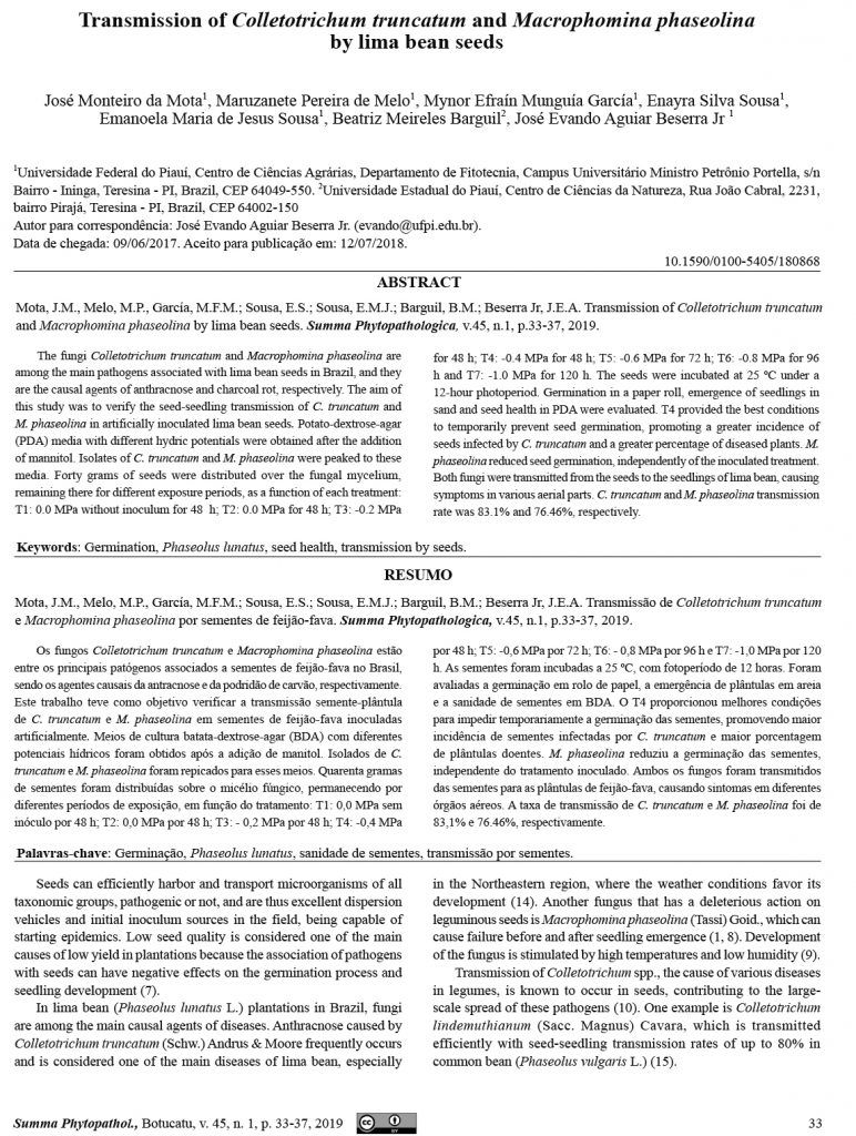 Artículo «Transmisión de Colletotrichum truncatum y Macrophomina phaseolina por semillas de frijol lima», publicado en la Revista Summa Phytopathologica.
