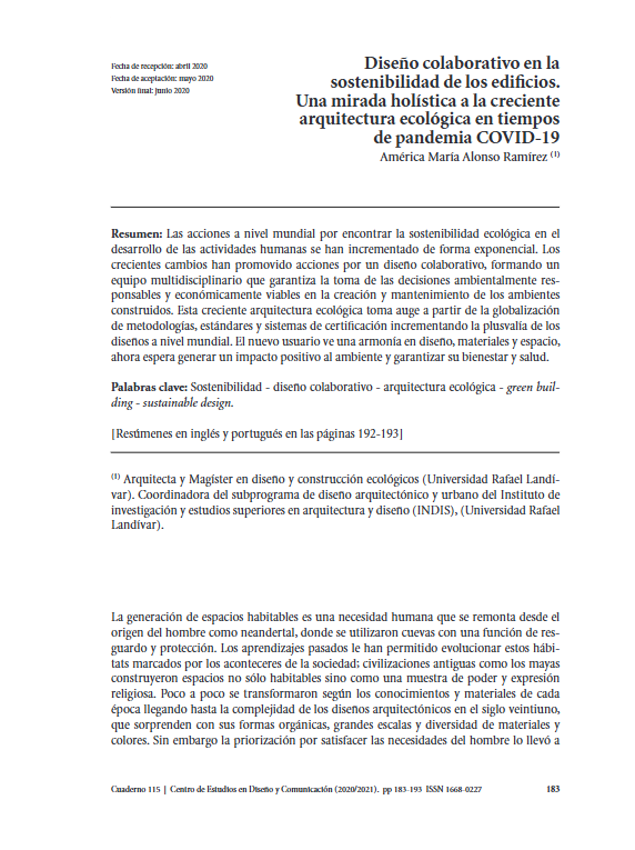 Read MoreLas acciones a nivel mundial por encontrar la sostenibilidad ecológica en el desarrollo de las actividades humanas se han incrementado de forma exponencial. Los crecientes cambios han promovido acciones por un diseño colaborativo, formando un equipo multidisciplinario que garantiza la toma de las decisiones ambientalmente responsables y económicamente viables en la creación y mantenimiento de los ambientes construidos. Esta creciente arquitectura ecológica toma auge a...