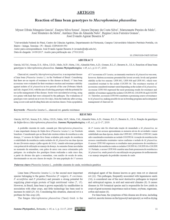 Artículo: Reacción de genotipos de frijol lima a Macrophomina phaseolina publicado en la Revista Summa Phytopathologica (Summa phytopathol. vol.45 no.1 Botucatu Jan./Mar. 2019, 11-17)...