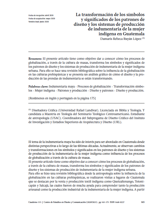 Read MoreEl presente artículo tiene como objetivo dar a conocer cómo los procesos de globalización, a través de la cultura de masas, transforma los símbolos y significados de los patrones de diseño y los sistemas de producción de indumentaria de la mujer indígena urbana. Para ello se hace una revisión bibliográfica sobre la influencia de la globalización en las culturas prehispánicas y se presenta un análisis...