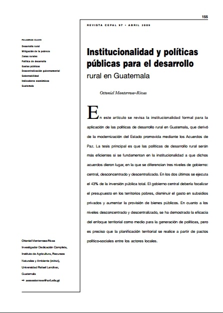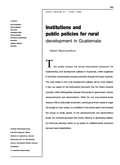 En este artículo se revisa la institucionalidad formal para la aplicación de las políticas de desarrollo rural en Guatemala, que derivó de la modernización del Estado promovida mediante los Acuerdos de Paz (versión en inglés) ....